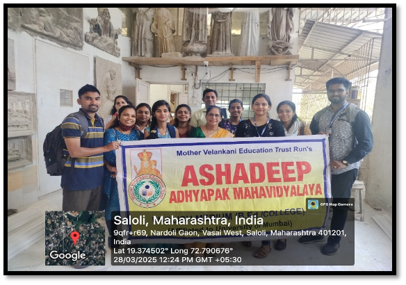 Ashadeep Adhyapak Mahavidyalaya organized a field visit for B.Ed. students on 28th March 2025 to Mamoosha Smruti, providing hands-on exposure to the art of statue-making and its educational relevance. The visit aimed to enhance students’ understanding of creativity, observation, and experiential learning in teaching.